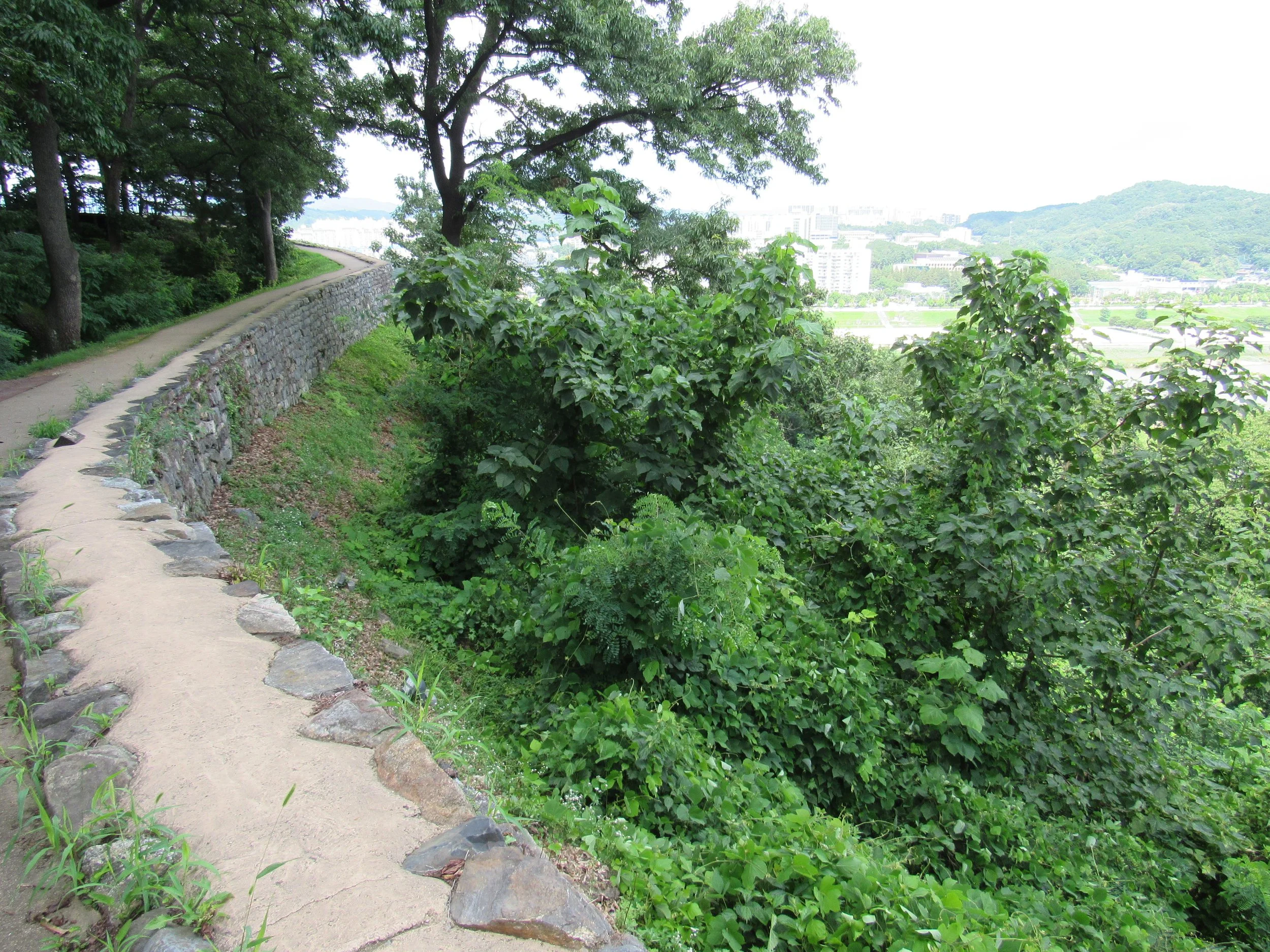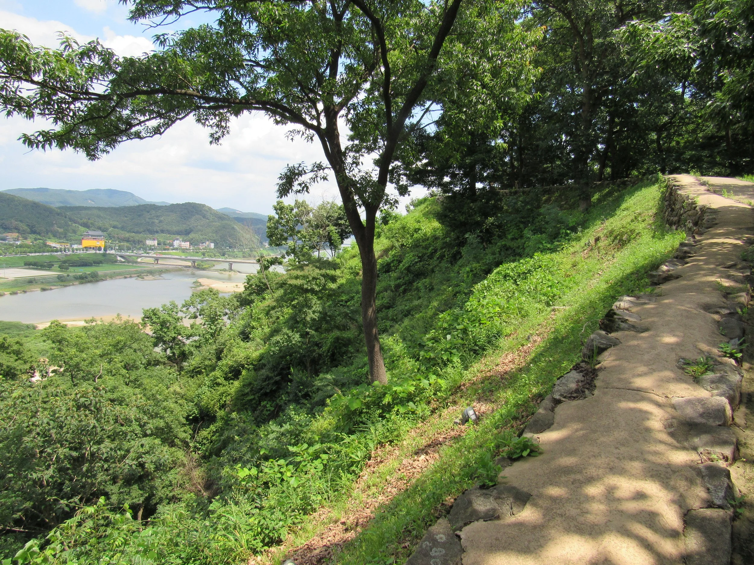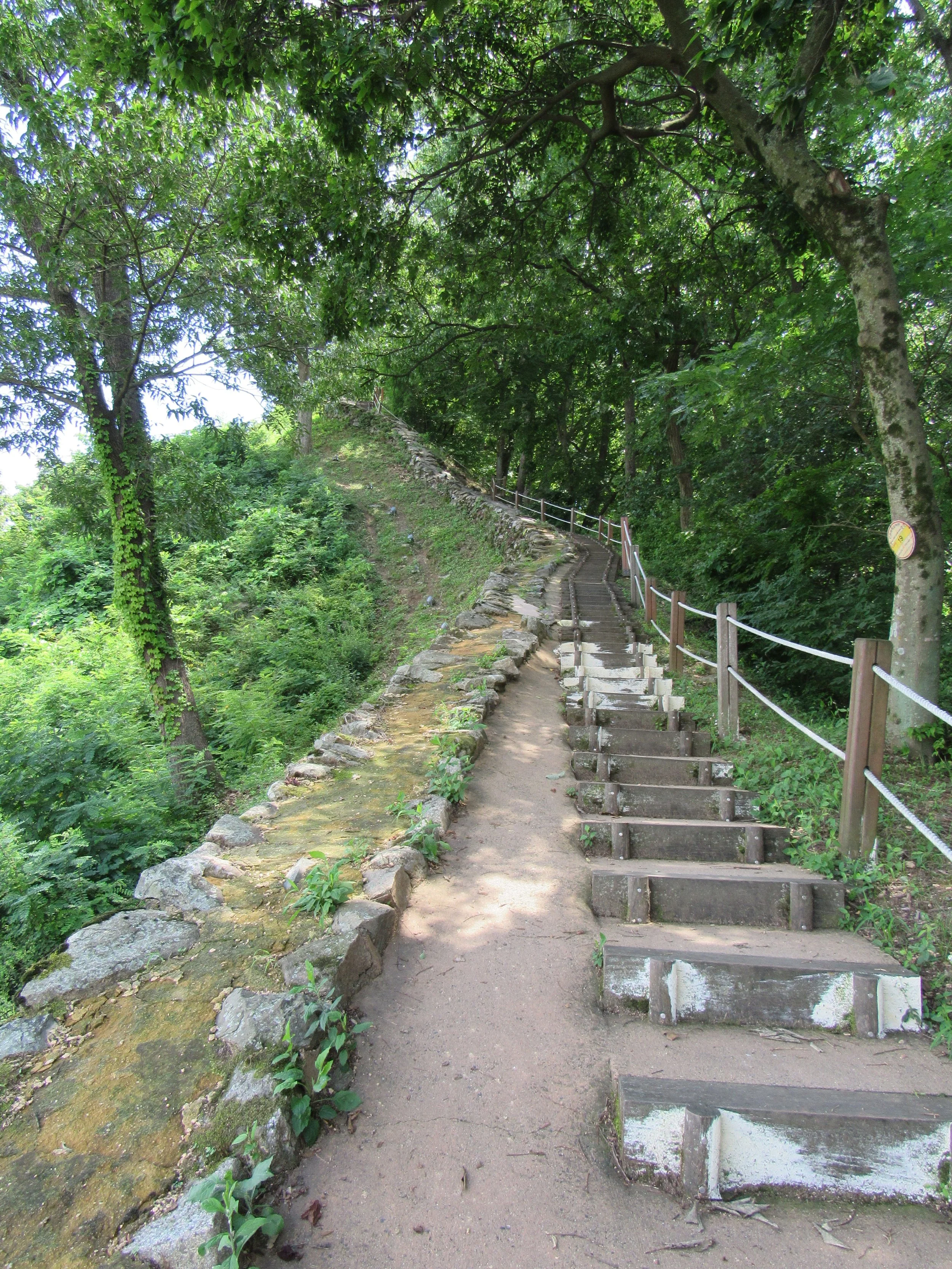 This picture, leading down to Yeongdongru Gate, gives a good idea of what rammed earth walls—absent their masonry outer layer—looked like. In the 5th Century A.D., the majority of Ungjinseong’s walls would have appeared like this. You will find similar walls in nearly all Korean Three Kingdom Era fortifications, including at Haengjusanseong just west of Seoul.