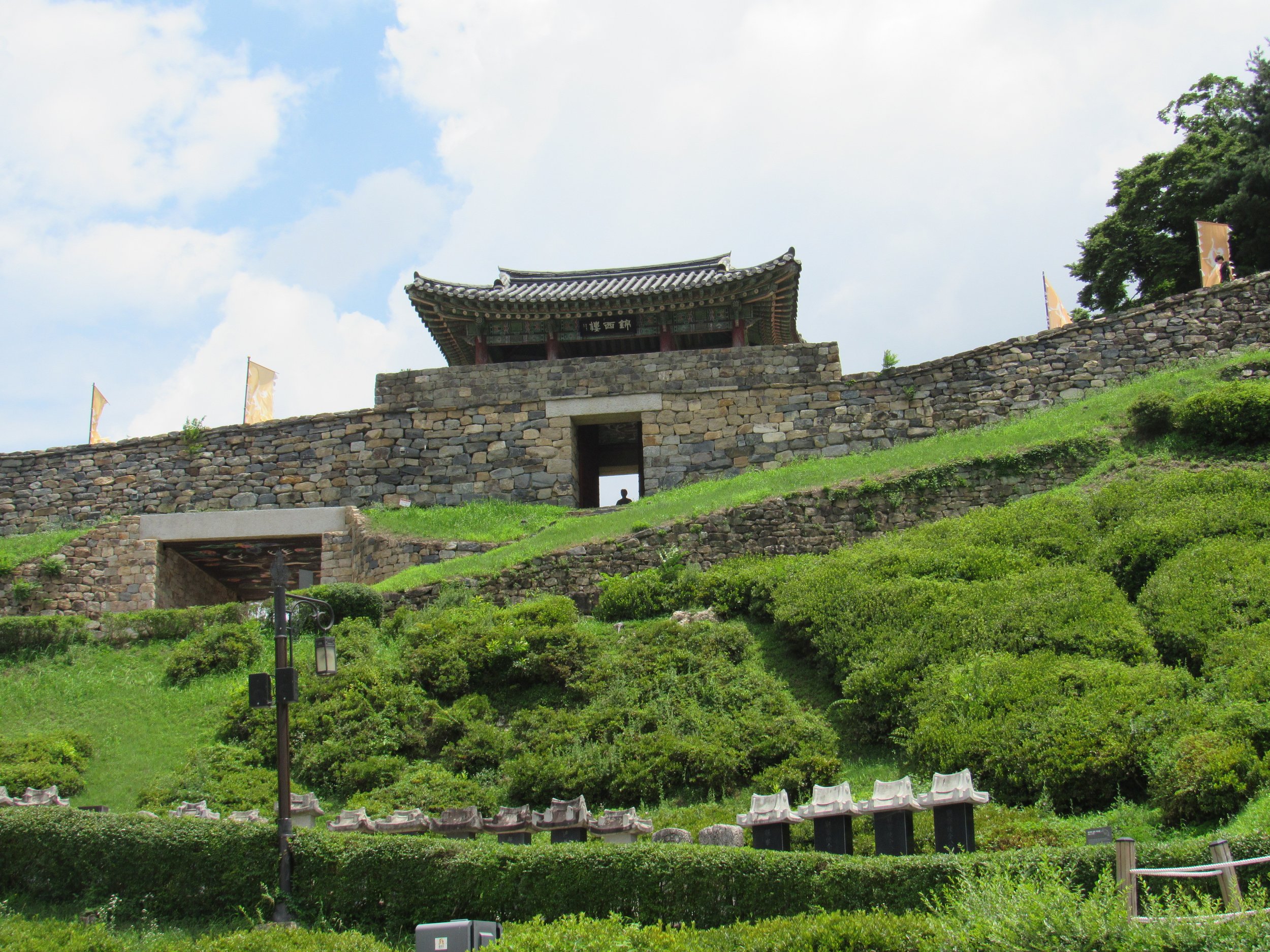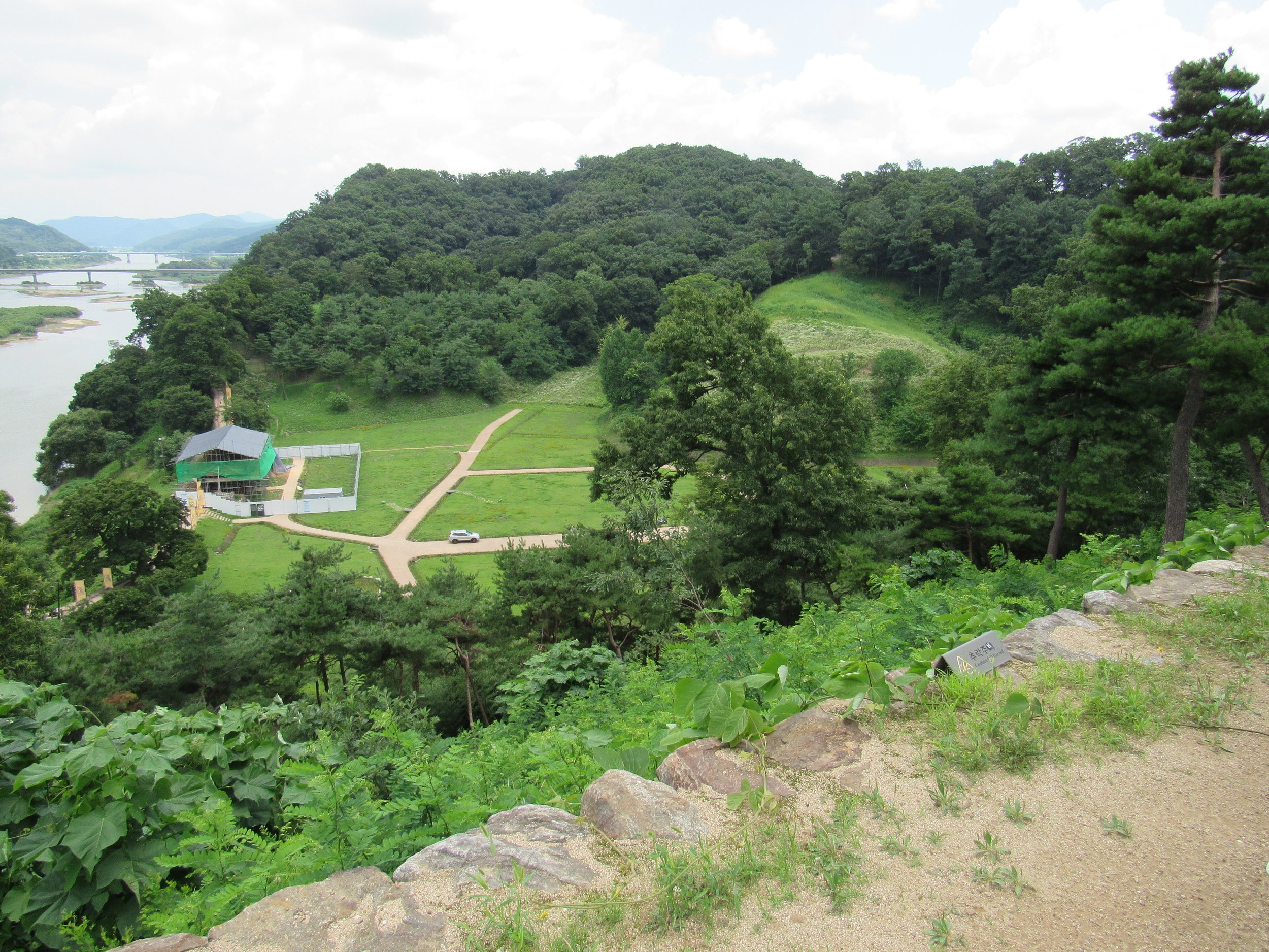 This large bowl in the western half of Gongsanseong Fortress is where much of the Baekje Palace compound stood 1,800 years ago. Archaeological excavations have mapped out principal buildings and facilities, but you have to imagine all the grassy areas below were once covered in wood and tile buildings related to the king and his inner bureaucracy.
