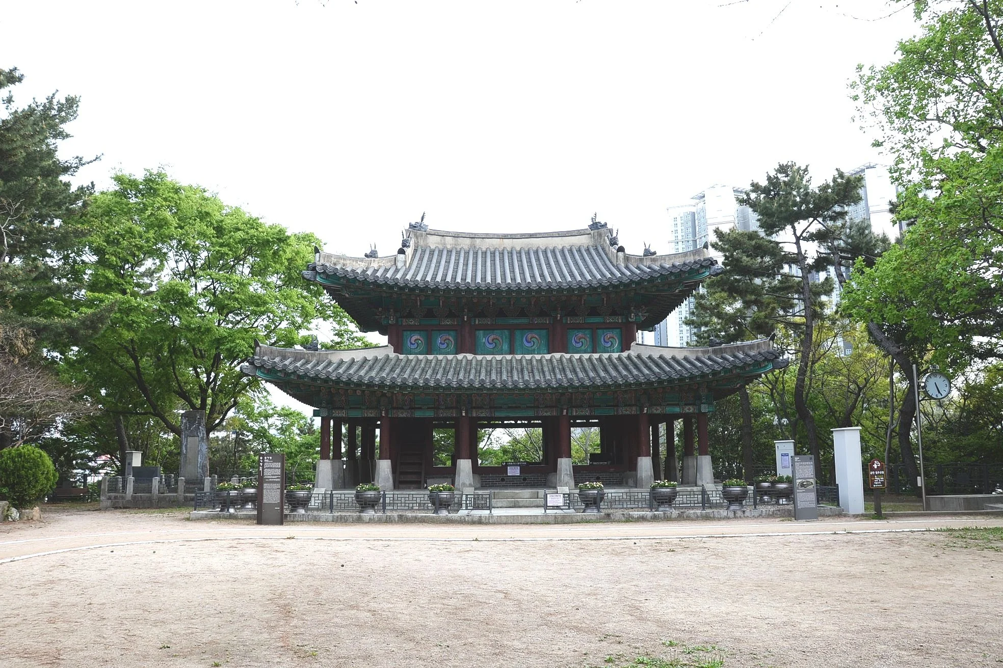 Another view of the gatehouse. Note the presence of tall, modern apartment buildings in the background. This is clear evidence of the extent to which land has been reclaimed from the sea at Busan. Waves used to wash up just below Jaseongdae’s gates.