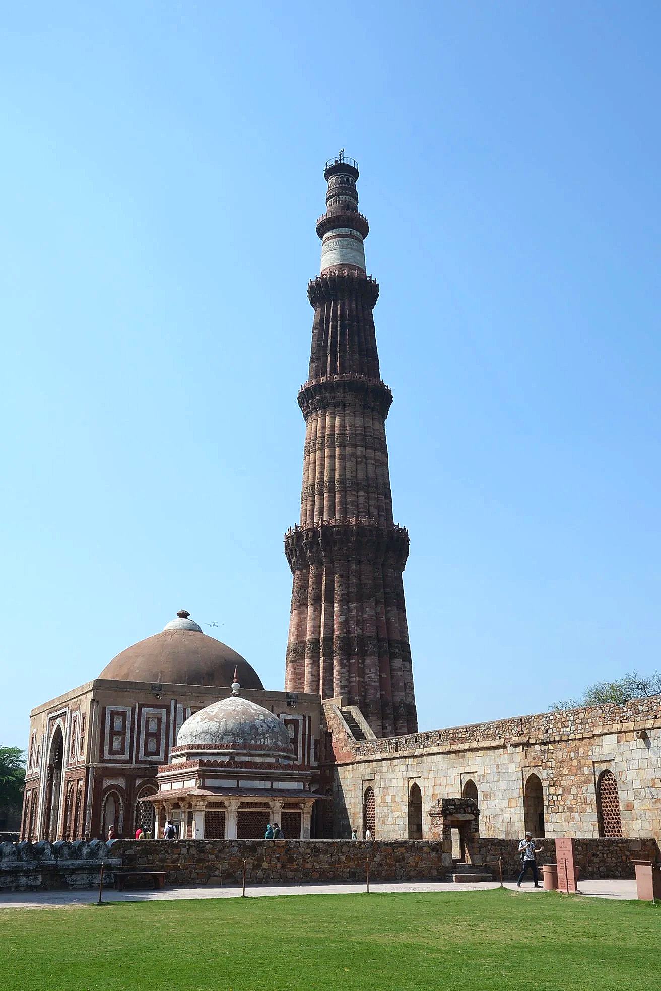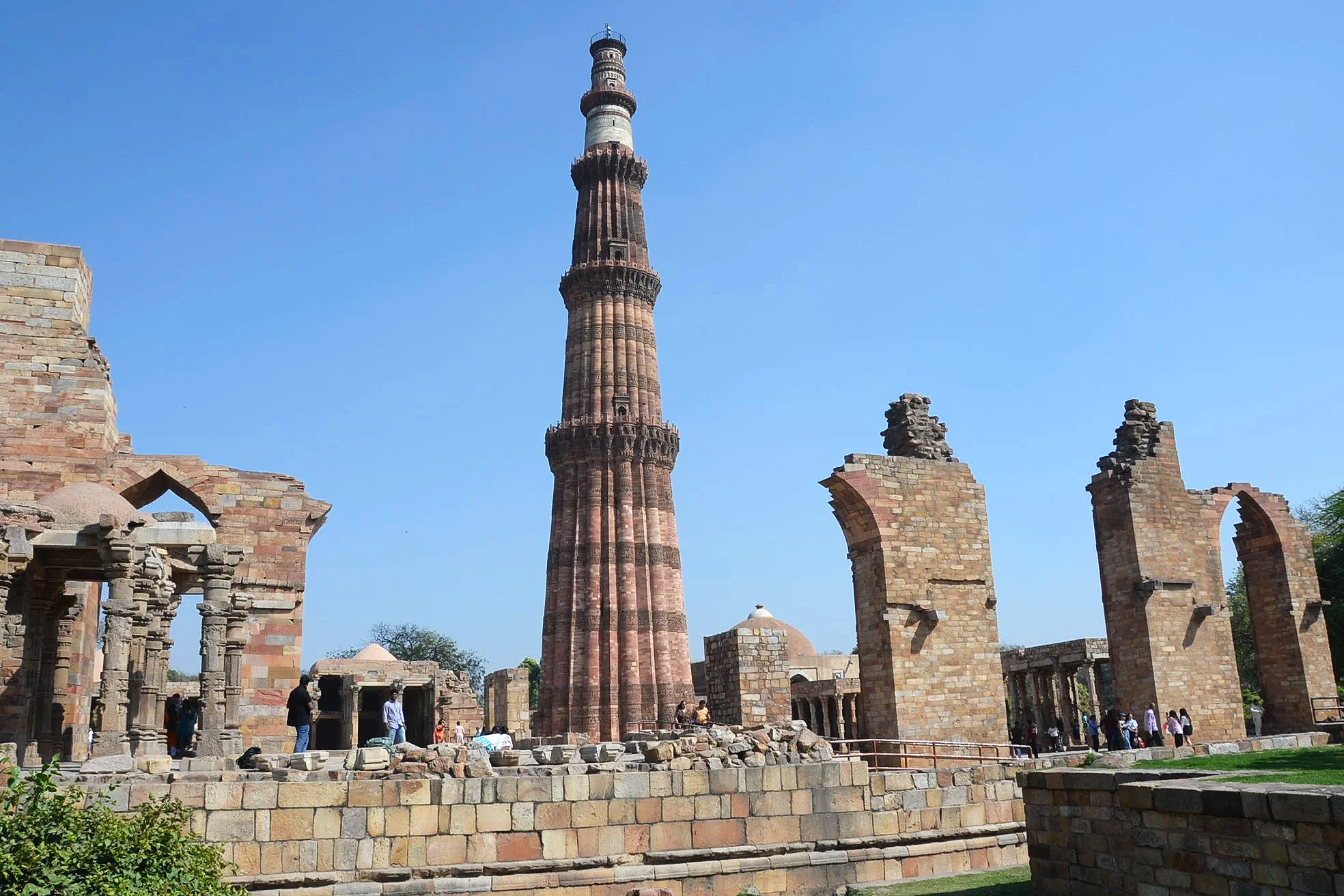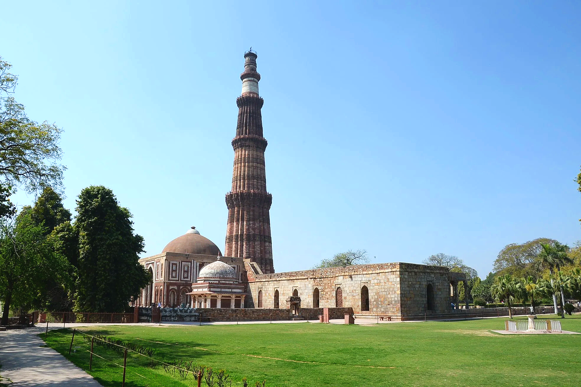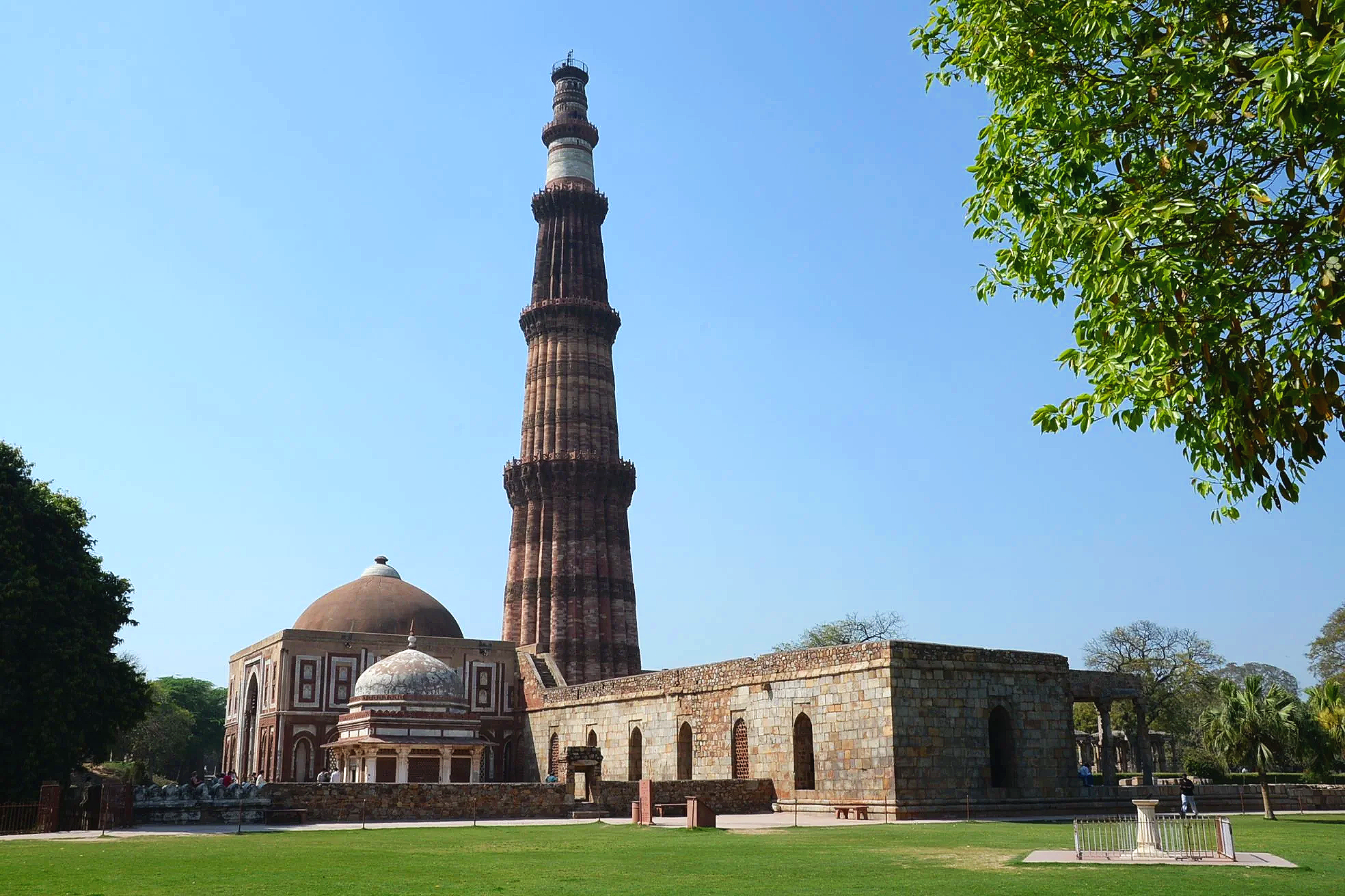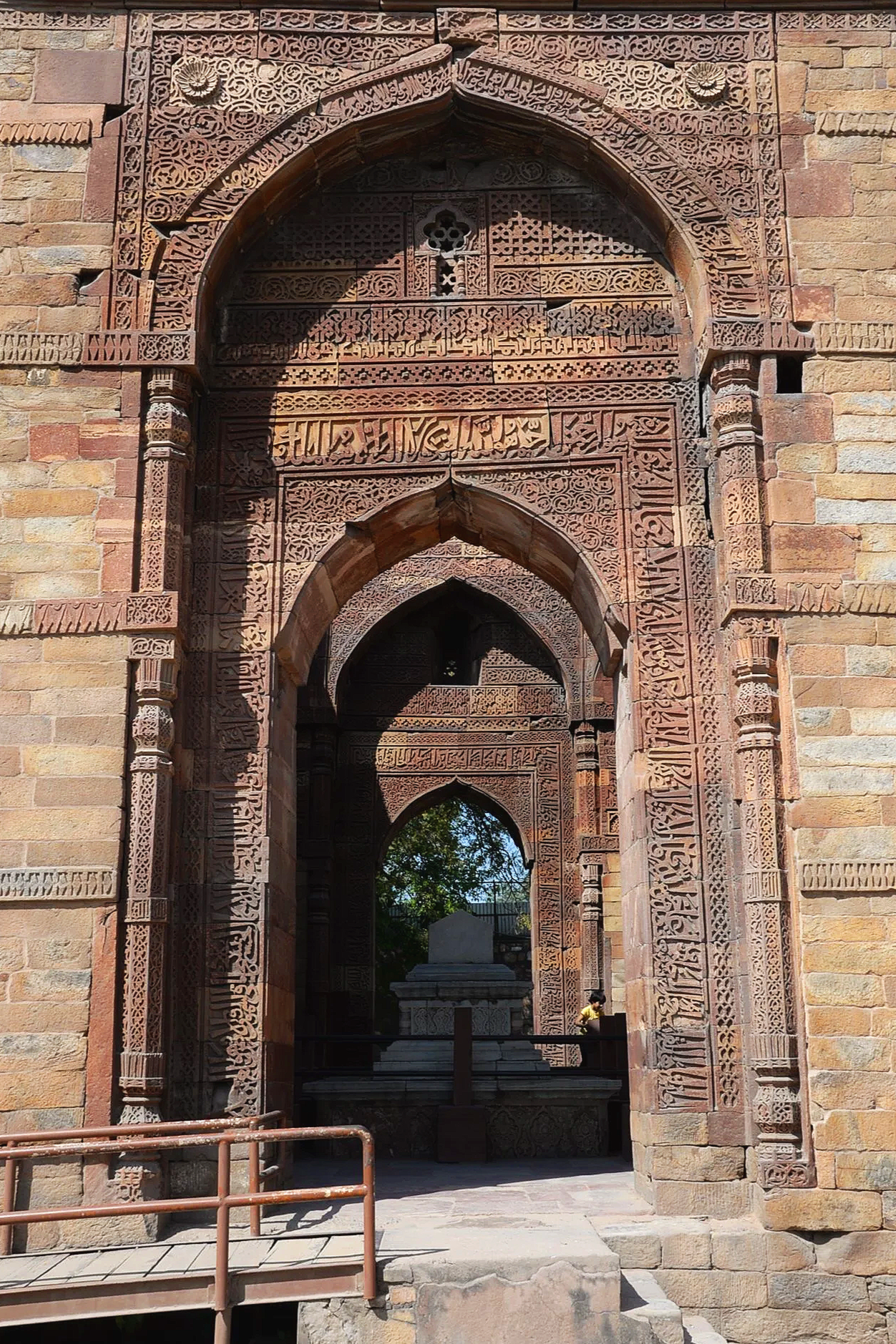 The beginning of construction on this minaret and victory tower in 1199 celebrated the defeat of Hindu rulers over the Delhi Sultanate and ushered in Muslim rule under the Ghurid general and Sultan, Qutb ud-Din Aibak (1206-1210), a conqueror of Tajik descent. He’d only complete the first level, however, and left it to successive dynasties to complete. By 1368, under Sultan Firuz Shah Tughlaq (1351-1388), the tower was completed in its current form. The minaret is 72 meters (238 ft) high and one must climb 399 internal steps to reach the cupola on top. The associated mosque and surrounding compound were built on the site of previous Hindu temples and elements of those ancient constructions were retained.