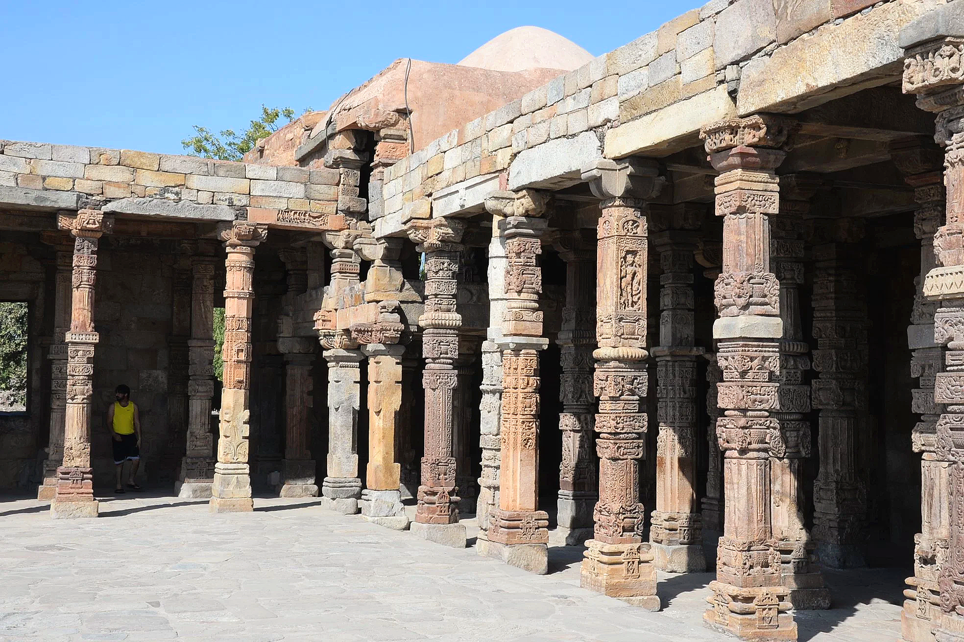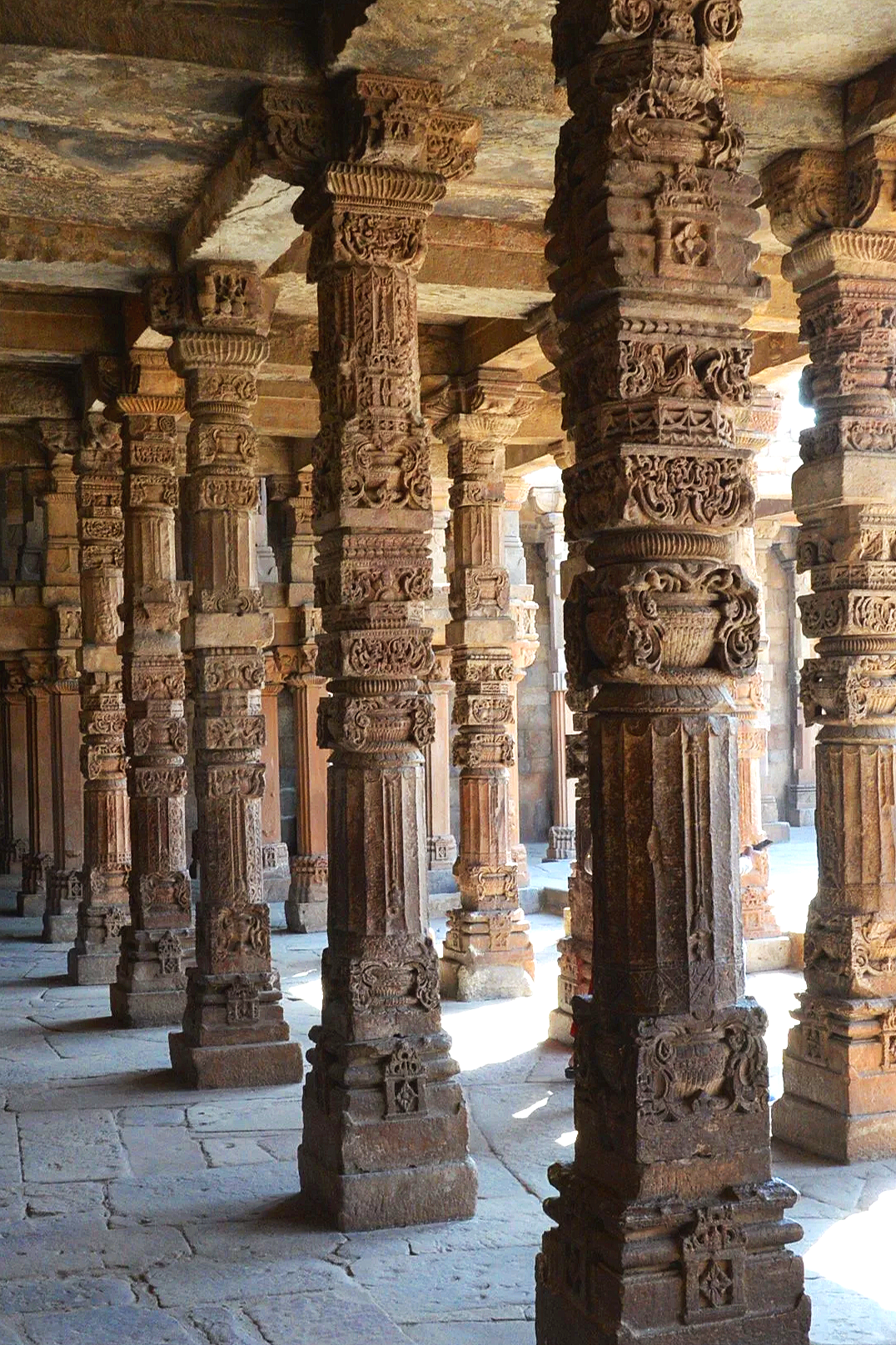 A look at the pillars salvaged from the ancient Hindu temple that stood on the site before being cleared away to construct the minaret and associated mosque.