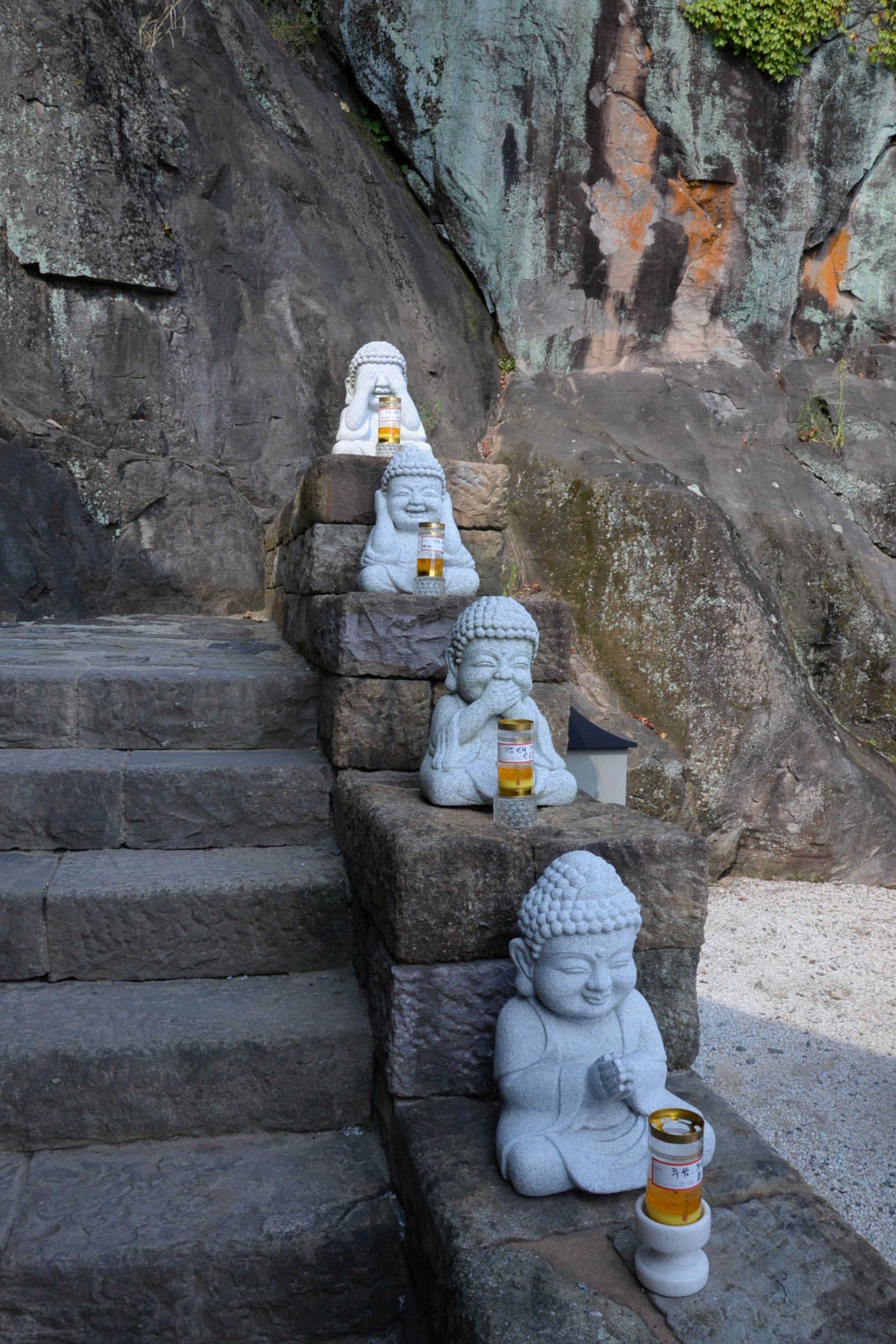 It’s easy to see why the site was originally chosen by those monks desiring to get away from civilization and focus on their meditations. Saseongam is quite remote. You can reach the site by a wicked climb or take a small village bus that departs roughly every 15 minutes. Don’t judge us—we are getting old, after all—but in this case we chose the bus…and endured/enjoyed the most perilous roller coaster ride of our lives! The 70 year-old bus driver, who’s no doubt made thousands of trips up and down the mountain, accelerated into the most perilous of hairpin curves, mere feet from sheer, hundred foot drop-offs and left us all holding on for dear life!!